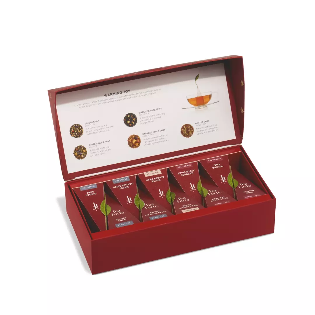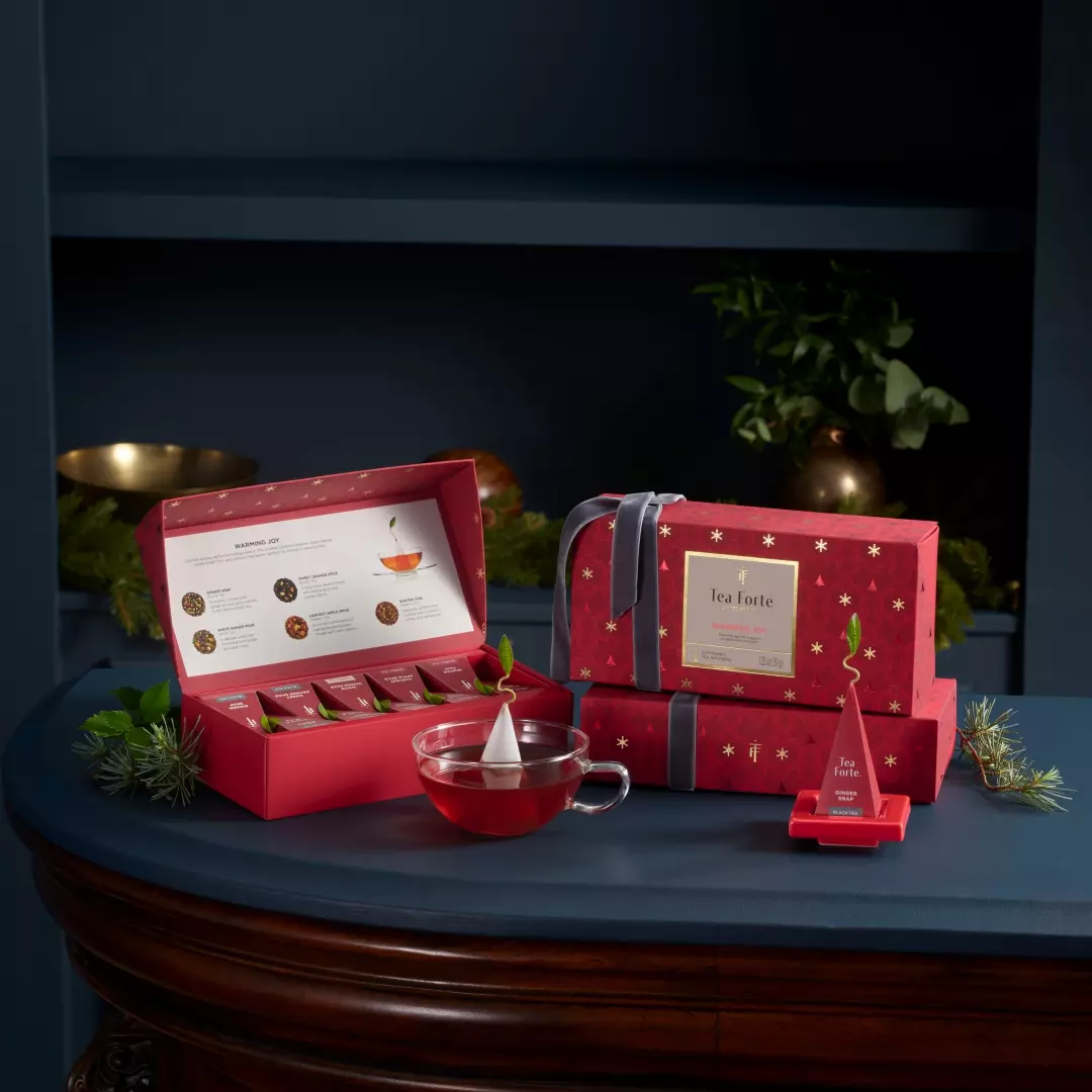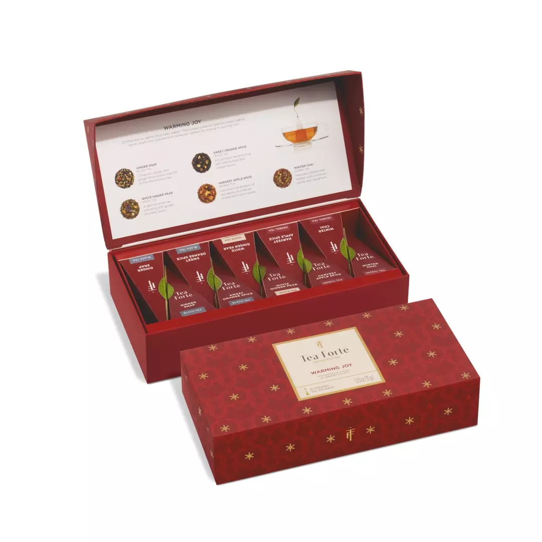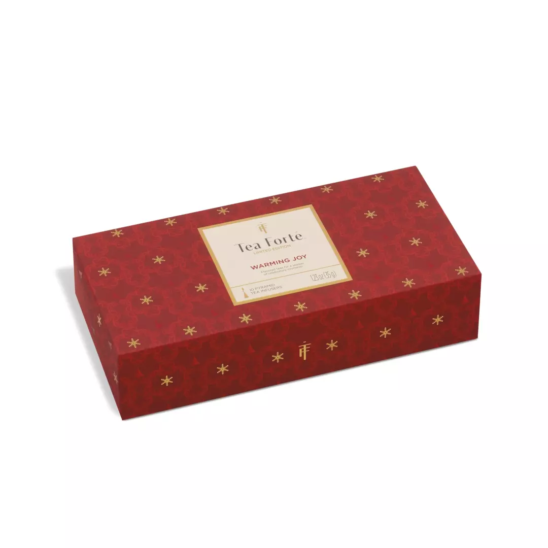 Kolekcja Warming Joy wyróżnia się zachwycającymi opakowaniami. W środku pięknie prezentują się ręcznie układane czerwone piramidki. Każde pudełko zawiera wewnątrz opis smaków i rodzajów herbat znajdujących się w zestawie. Ekologiczne herbaty i wyłącznie naturalne składniki sprawiają, że herbaty z tej kolekcji smakują naprawdę wyjątkowo.