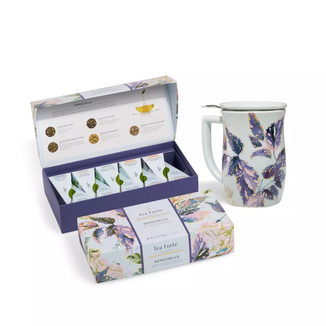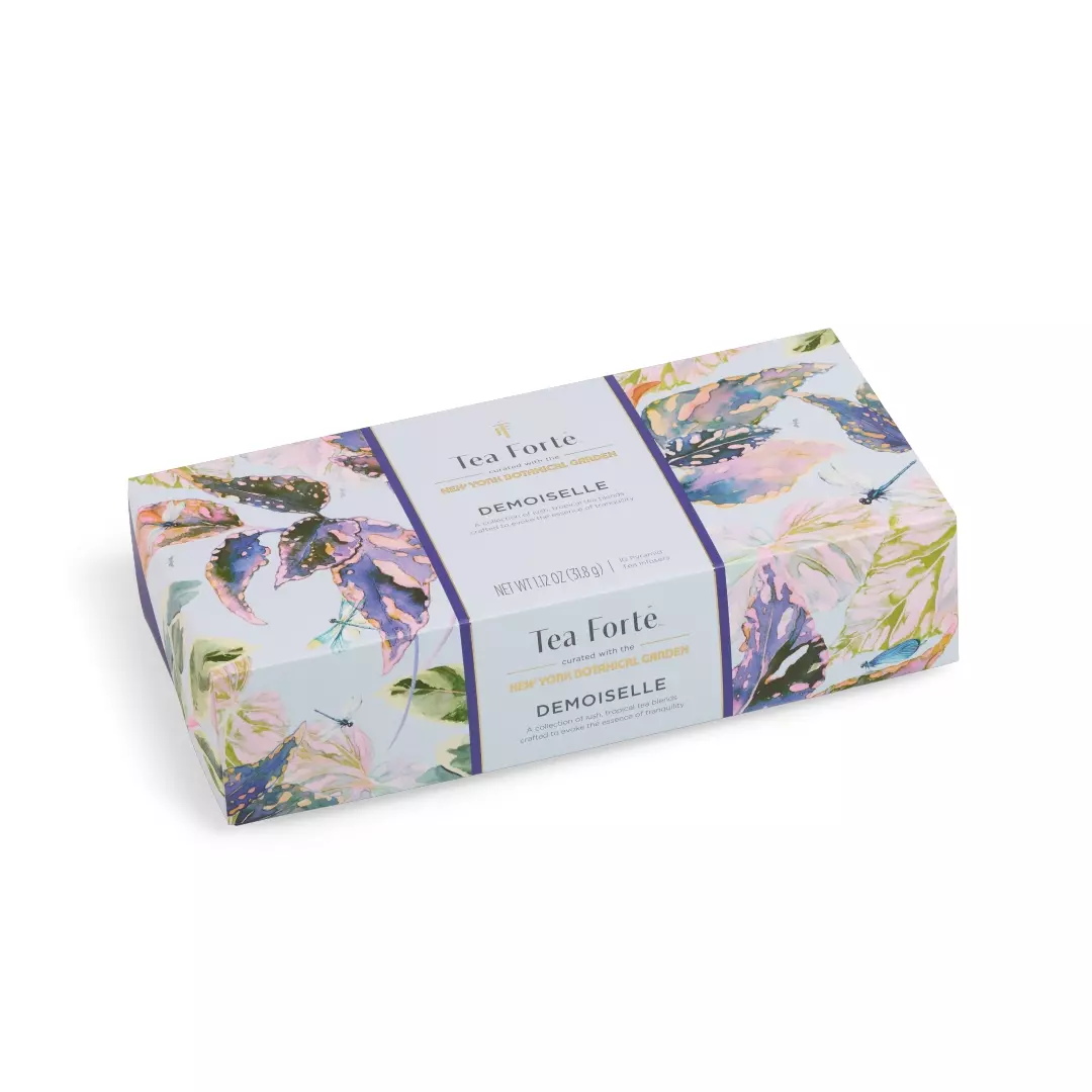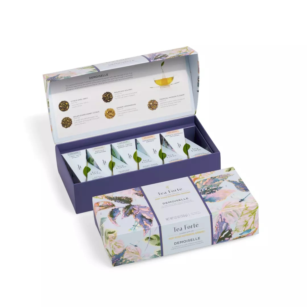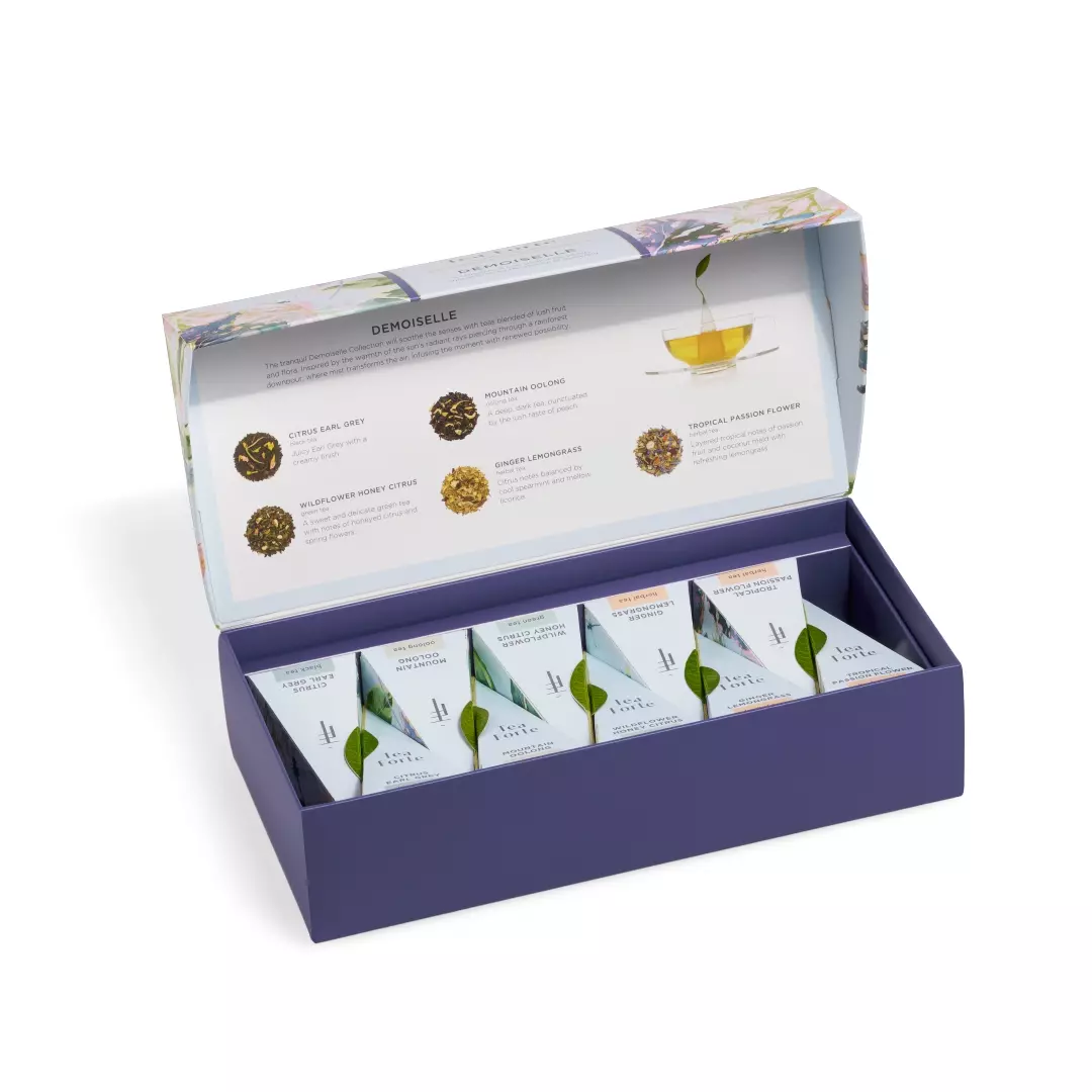 Pudełko Demoiselle Petite Presentation Box zawiera 10 piramidek z 5 mieszankami: Citrus Earl Grey (herbata czarna), Mountain Oolong (herbata oolong), Wildflower Honey Citrus (herbata zielona), Ginger Lemongrass (herbata ziołowa) i nasza najnowsza mieszanka bezkofeinowa, Tropical Passion Flower (herbata ziołowa).