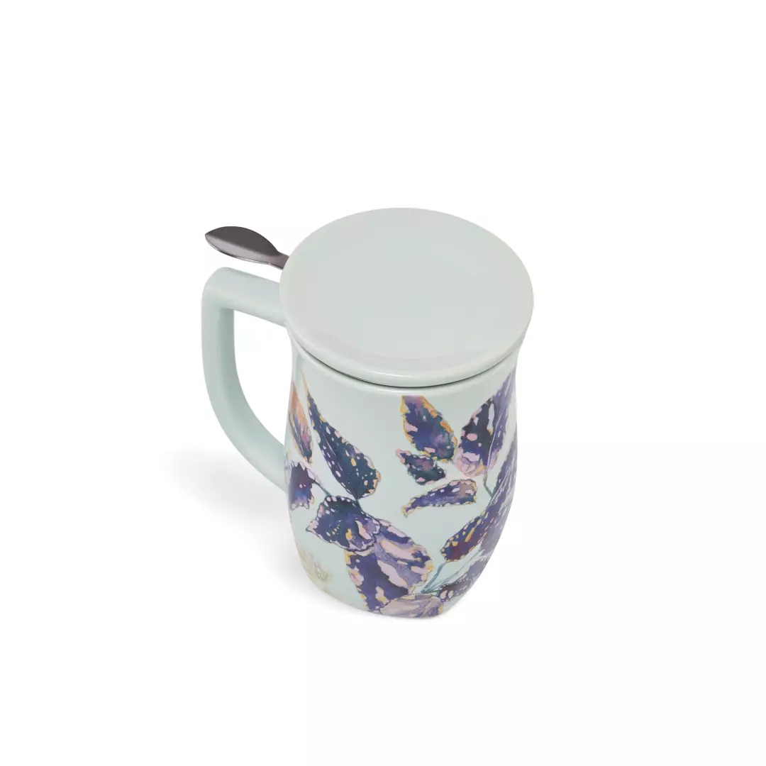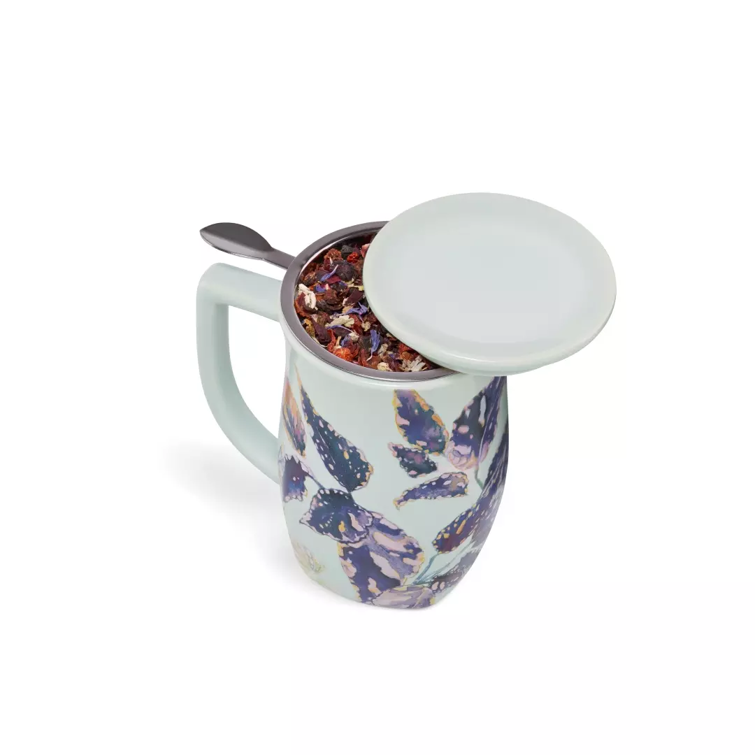 Kubek ceramiczny zawiera stalowe sitko i pokrywkę. Podwójne ścianki utrzymują temperaturę napoju. Świetnie sprawdzi się w domowym zaciszu i w pracy.